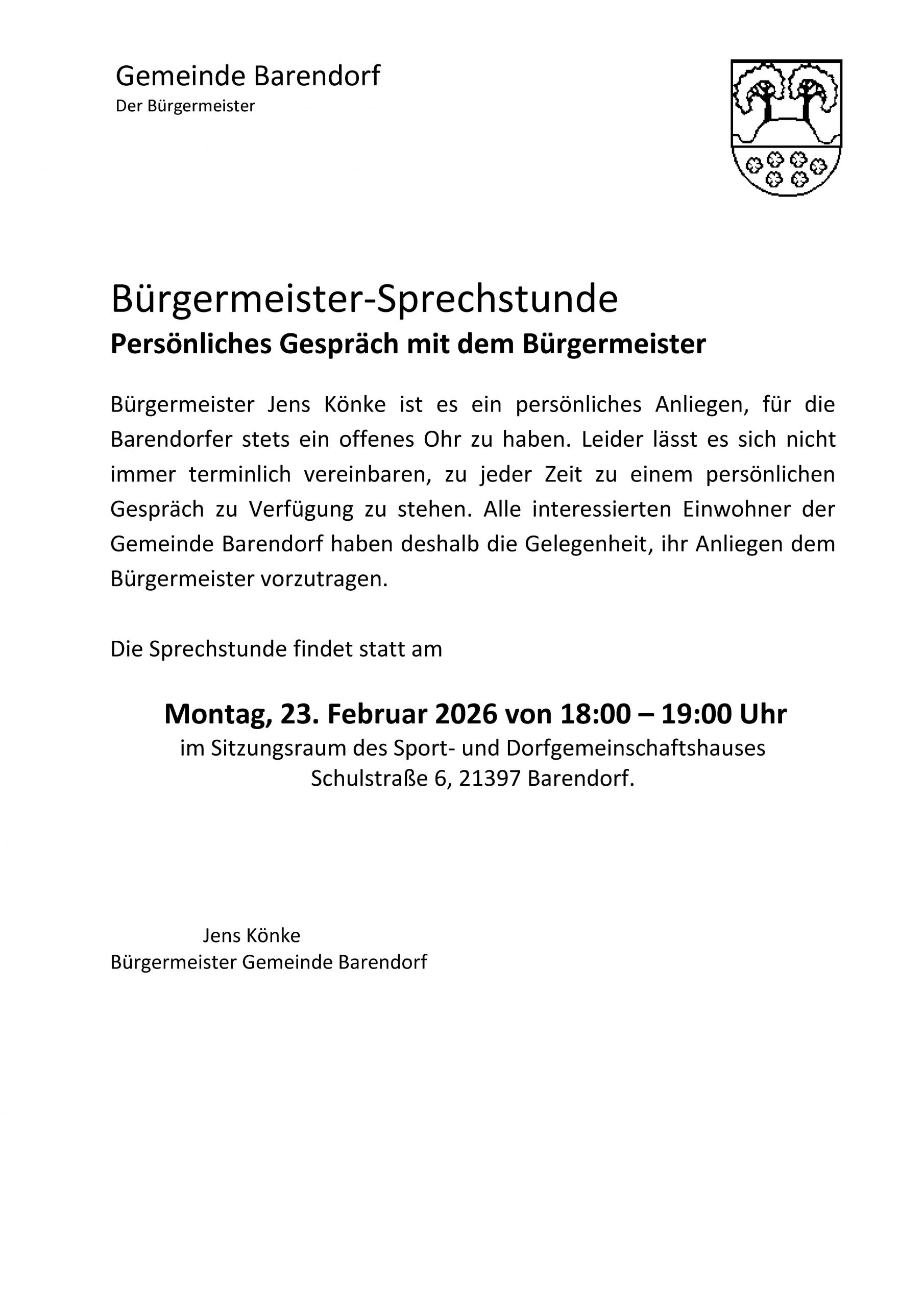 | Bürgermeister-Sprechstunde | 1771869600 23.02.2026 |